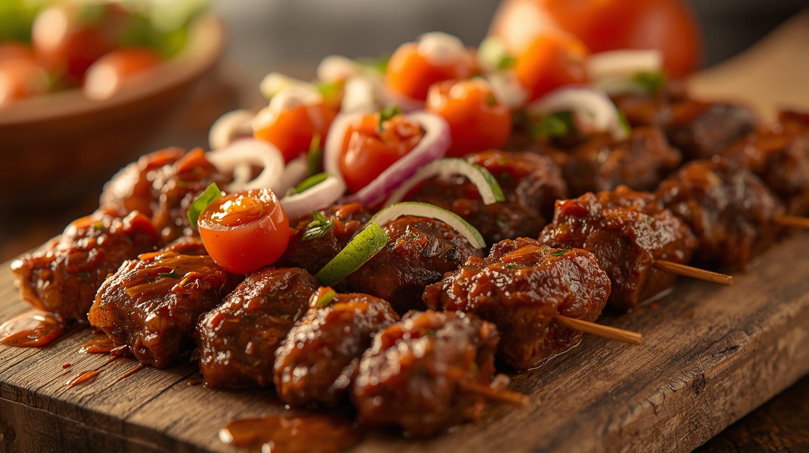 Charcoal-grilled beef suya served with onions and pepper.